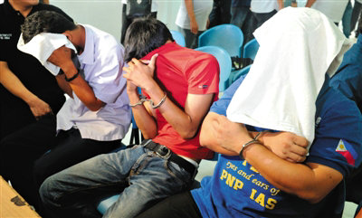 资料图:菲律宾马尼拉,被扣押在菲司法部的3名疑犯。