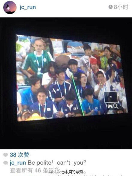 2014年8月28日,2014年南京青奥会闭幕式举行,外国运动员在现场拿激光笔照射演出人员和嘉宾的眼睛。图片来自于账号为jc_run的Instagram,jc_run还附上了一段英文:“Be polite!can't you?(能不能有礼貌一点。)”。