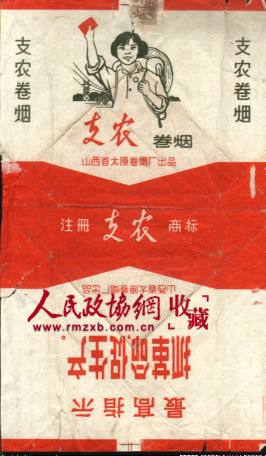 尽管如此,但我心里总是牵挂着这些烟标,经常上网察看,尤其是看到这枚别具一格的《支农》牌烟标,总忍不住多看几眼。这枚烟标的确叫人心动,一边图案是一个梳着齐耳短发、卷着袖子的女青年,左手握着背包绳,右手高举“红宝书”;另一边图案是套红印刷的几个大字:“最高指示———抓革命,促生产。”这枚烟标的“文革”味很浓,具有较高的收藏价值。以后,我还是常常上网察看,了解这些“文革”烟标的动向,但这些烟标依然挂在上面,很长时间也没有被人买去。我想,这是好事情,咱俩比耐心吧,看谁熬得过谁,不跌到地板价,我就坚决不买它。时间一晃一年快过去了,朋友对我说晾的功夫差不多了,他应该会让步了,让我静候佳音。果然,没过几天,朋友传话来说,对方给晾得够呛,早已耐不住,不再坚持原价了,朋友抓住机会用一个很低的价格把这些烟标全部拍了过来。