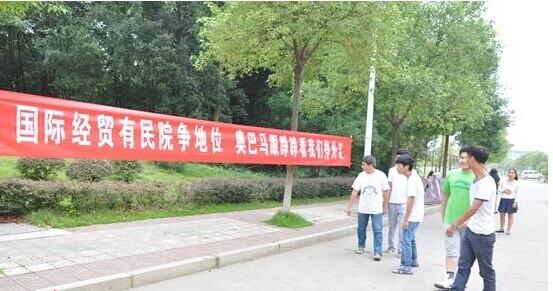 记者一进校门,铺天盖地的标语映入眼帘,除了欢迎新生入学的常规标语外,一些内容新颖、亲切生动、风趣幽默的标语吸人眼球,象“民院不是熊出没的地方,千万别当熊孩子”首先就给新生一个亲切的警醒,“国际经贸有民院争地位,奥巴马眼睁睁看我们挣外汇”、“困难对我不屑一击,我对李嘉诚不屑一顾”、“学好工程技术,敢与盖茨比酷”、“建筑学子搭座桥,民院在这头,小马哥在那头”、“民院学习1000天,让你变成易中天”、“民院学艺术,玉刚当师傅;韩红变嫦娥,脱胎又换骨”等标语更是拿奥巴马、马云、李嘉诚、比尔。盖茨、易中天等名人说事儿,诙谐夸张之余,彰显专业特色,更是为新生励志鼓劲。