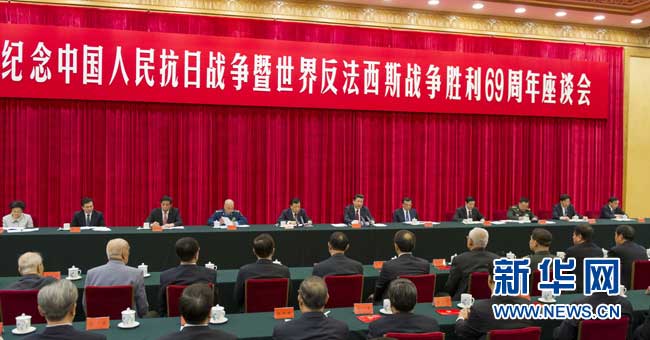 9月3日下午,中共中央、国务院、中央军委在北京人民大会堂举行座谈会,纪念中国人民抗日战争暨世界反法西斯战争胜利69周年。中共中央总书记、国家主席、中央军委主席习近平出席座谈会并发表重要讲话。新华社记者 谢环驰 摄
