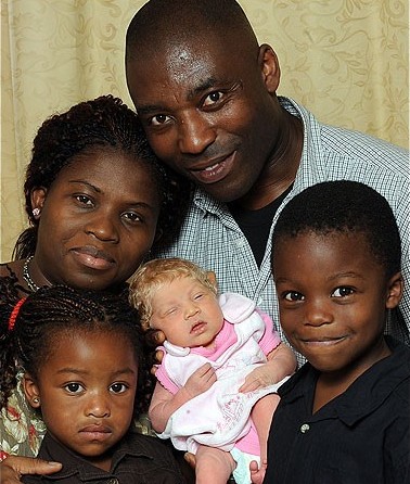2010年7月,在英国伦敦东部的伍尔维奇,一对尼日利亚黑人夫妇喜得他们的第三个孩子。让所有人意外的是,这个新生女婴居然是典型的白种人,长着漂亮的蓝眼睛和卷发。父亲本特别强调:“我和妻子很相爱,她一定会忠于我的。就算她没有忠于我,孩子也不会长成白种人。”遗传学专家表示,这个孩子很健康。这个女婴的出生真是“太不寻常”了?;蛲槐涫且桓隹赡艿慕馐?。