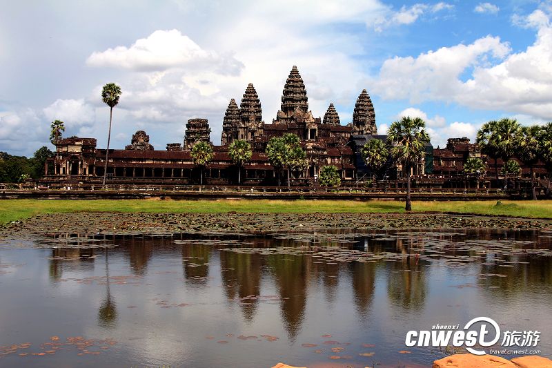 世界奇迹小吴哥庙的壮美风景。蓝天白云之下,五座神塔与五个倒影,这是吴哥旅游的代表性景观。