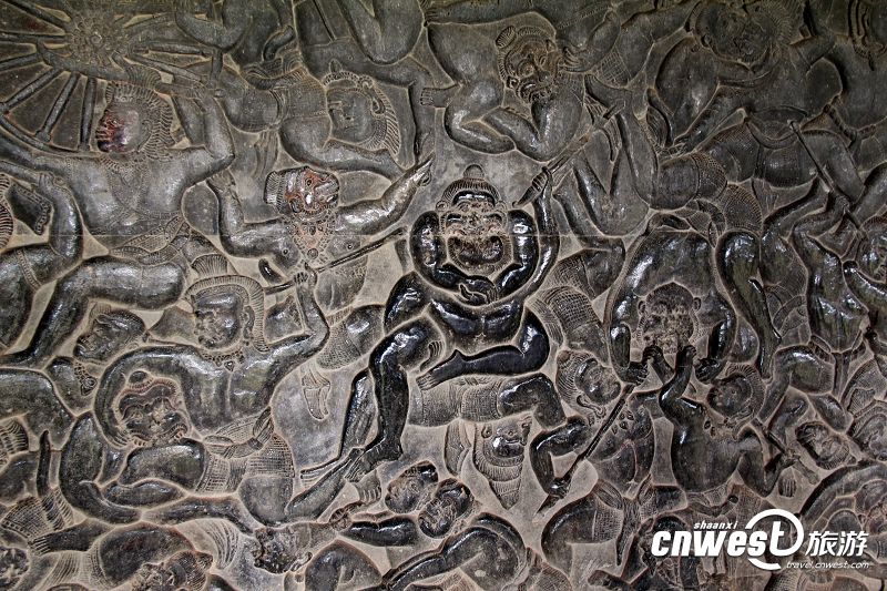 小吴哥庙走廊墙壁上精美的浮雕,展现的是?;ど裼牒镒油醮笳降墓适?。浮雕精细、立体感强,一些部分被游客摸得发亮。