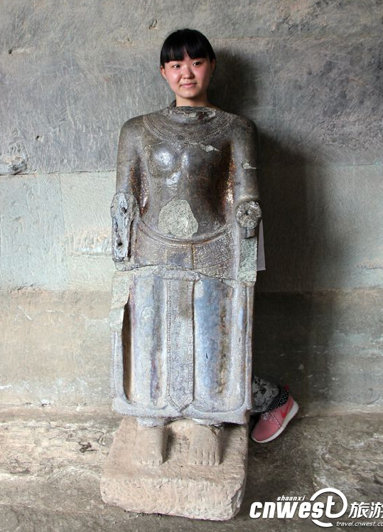 忒友“锦茹逛吃逛吃”看到被“斩首”的佛像心痛不已,挺身而出,站在佛像之后,用自己的头部为残缺的神像补齐残缺,并以这种方式,倡导游客文明旅游、拒绝倒卖文物、以保护更多的历史遗存不受到破坏。
