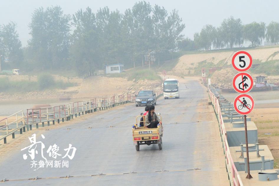 济南北店子黄河浮桥两侧也设有提示牌,禁止自行车上桥,一辆三轮车慢慢驶向对岸。(图文 李瑞平)