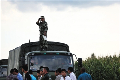 9月4日,青川乡百合村,武警站在车顶搜索逃犯。新京报记者 薛珺 摄
