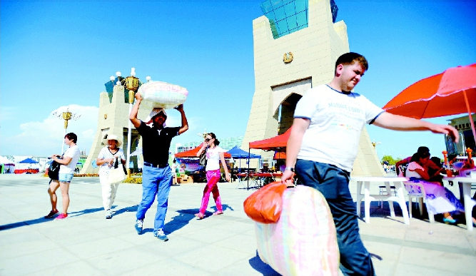 中哈霍尔果斯国际边境贸易区,中哈两边的生意堪称红火。哈萨克斯坦的游客购买中国的商品后,连提带扛地把货物运走。