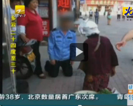 解说:当时目击这一事件的商户们说,两个人互跪的局面,持续的时间并不长,城管小伙也是边跪着边劝说大妈,几分钟之后,在大伙的劝说下,老太太被人给扶了起来,随后城管小伙也跟着站起来,对于这事围观商户看法不同。