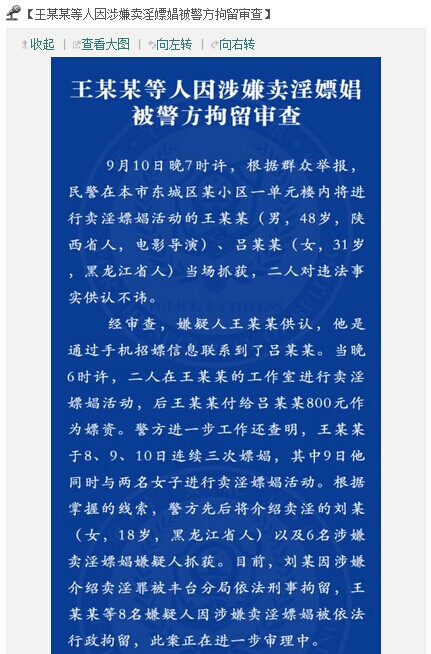 中新网9月15日电 据北京市公安局官方微博“平安北京”消息,9月10日晚7时许,根据群众举报,民警在北京市东城区某小区一单元楼内将进行卖淫嫖娼活动的王某某(男,48岁,陕西省人,电影导演)和吕某某(女,31岁,黑龙江省人)当场抓获,二人对犯罪事实供认不讳。