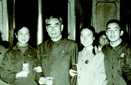 1969年,“五一”庆祝大会后,周恩来总理在天安门城楼同参加实况转播的中央人民广播电台记者刘振英(右一)和播音员合影。