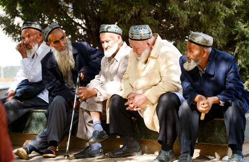 喀什的“主麻日”,做完礼拜的人们,三三两两地坐在艾提尕尔清真寺前的广场上,悠闲地聊着天。