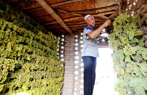 家中来了客人,沙塔·托乎提热情地从晒房内取出新鲜的葡萄招待我们。