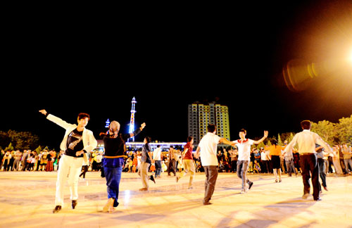 麦盖提夜晚,县委大楼前面的刀郎文化广场上,热闹非凡,随着欢快的音乐,男女老少翩翩起舞。