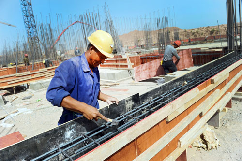 在喀什施工中的广州新城,这是广州的援疆项目,工地内工人忙碌着。