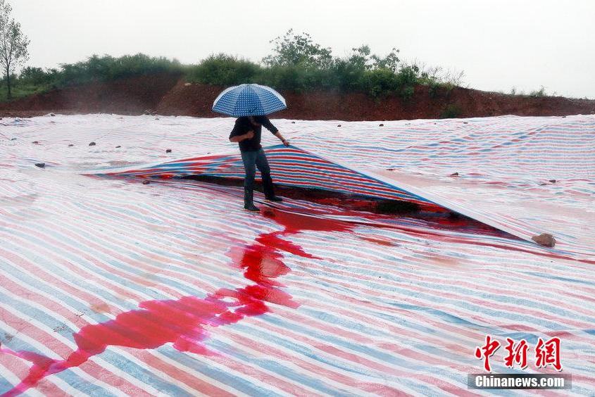 2014年9月15日,河南洛阳汝阳县马兰河因为污染变成一条“红河”,“红水”顺着山坡一直流到山下,而“红水”的源头正是附近一山顶的染料厂残留处理池。图为山顶涂料厂未处理的残渣被塑料布覆盖,因多日降雨,染红的雨水从山流下。