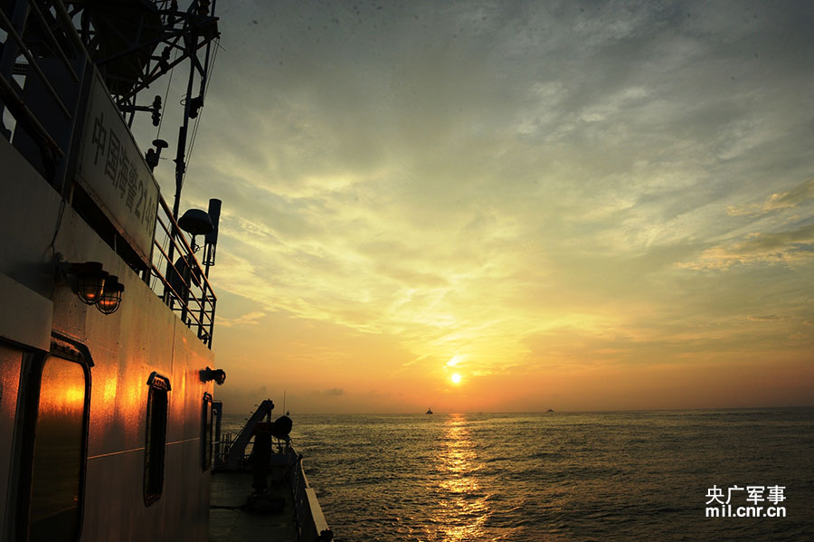 中国海警编队巡航钓鱼岛途中,经过大风大浪,那天雨过天晴,又是一个清晨,透过东侧甲板,记者第一次从东西向看到了钓鱼岛本岛!它在海天交界处只是露出了一个三角形的山头,青黑色的,下面有一层薄薄的云雾。当时海面上风平浪静,太阳从云缝里放出光芒,在海面上洒出一道闪闪金光,几只海鸥在自由飞翔。船长告诉记者,不远处是一只台湾渔船在捕鱼作业。哎!真是太美了,梦想中的画面竟然就在眼前!大家恨不得离得近一点,再近一点,把钓鱼岛看得清楚一点儿,再清楚一点儿!