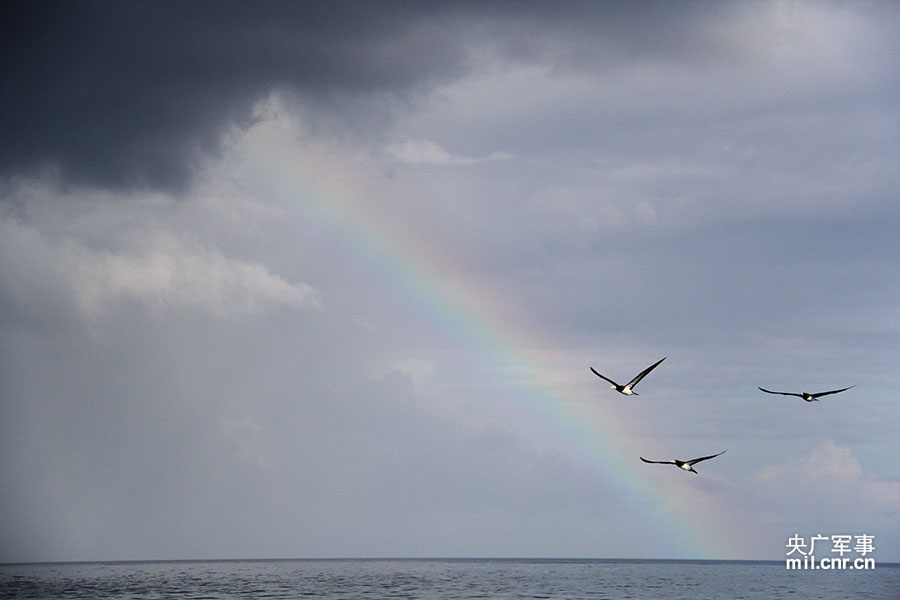 钓鱼岛海域巡航途中雨后彩虹伴飞海鸟 何端端摄