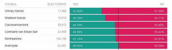 苏格兰克拉克曼南郡率先公布投票结果,选民数为39972,总体比例为支持46.2%:反对53.8%。第二个地区奥克尼群岛其次公布投票结果,选民数为17806,总体比例为支持32.8%:反对67.2%。第三个地区设得兰群岛公布投票结果,选民数为18516,总体比例为支持36.29%:反对63.71%。第四个地区埃利安锡尔郡公布投票结果,选民数为22908,总体比例为支持46.58%:反对53.42%。第五个地区因弗克莱德公布投票结果,选民数为62481,总体比例为支持49.92%:反对50.08%。第六个地区伦弗鲁郡公布投票结果,选民数为134735,总体比例为支持47.19%:反对52.81%。