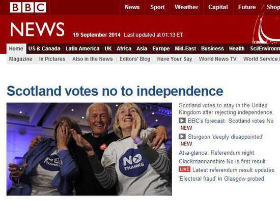 中国网9月19日讯 据英国广播公司BBC刚刚报道,根据苏格兰法夫投票站最新统计结果,英国官方当地时间19日表示,苏格兰独立宣告失败。