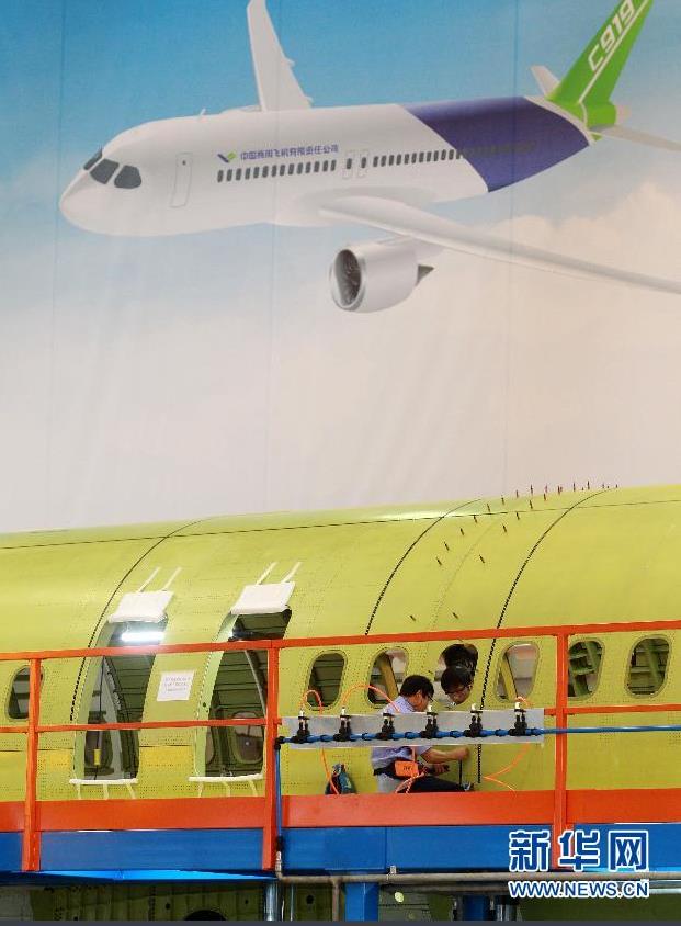 9月19日,技术人员对接C919首架机的机体。当日,C919国产大型客机首架机在中国商飞公司新落成的总装制造中心正式开始机体对接,这标志着C919大型客机研制项目全面进入结构总装攻坚阶段。项目力争年底完成首架机机体结构对接,2015年底实现首飞。新华社记者丁汀 摄