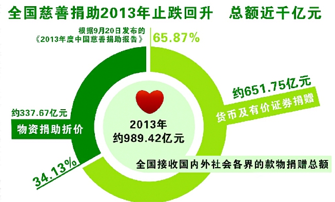 民政部所属的中民慈善捐助信息中心9月20日在第三届中国公益慈善项目交流展示会上发布《2013年度中国慈善捐助报告》。数据显示,2013年我国接收国内外社会各界的款物捐赠总额约989.42亿元,和2012年相比,同比增长21.06%。这也是该机构连续第7年发布全国性的捐赠统计数据。