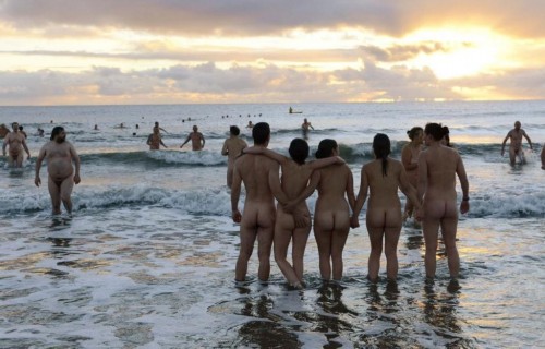 据《每日邮报》2014年9月21日报道,英国诺森伯兰郡,超过350人参加第三届东北裸泳活动,欲打破最多人同时裸泳的世界纪录。该活动由国民托管组织主办,活动参与者早晨5点半抵达沙滩,于日出之时下海。(网页截图)
