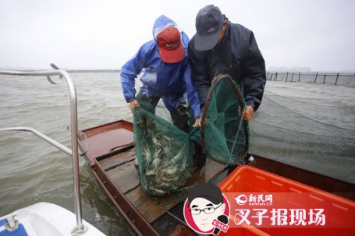 图说:由于今年气候风调雨顺,水质优良,湖区河蟹普遍长势良好,河蟹的平均重量比去年同期增加近一成。新民网记者 萧君玮 摄