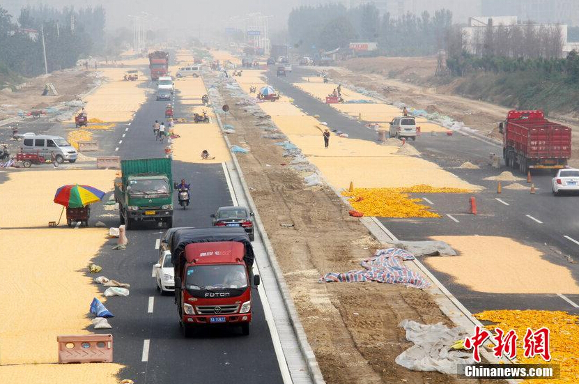 2014年09月26日,河南省郑州市科学大道约5公里长新修路段,到处晾晒着玉米,占去2/3车道,场面壮观,当地村民称之为“黄金大道”。只要天气晴好,玉米晒上两三天,就可以就地打粒,然后装车卖出,非常省事儿。