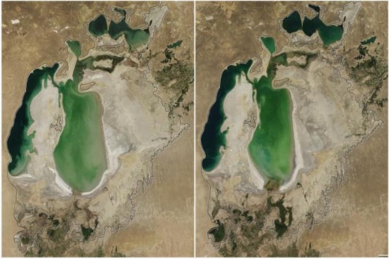 据美国宇航局地理学家分析,中亚这一拥有550万年历史的古老湖泊已经很久没有像现在这么干旱过了,这很有可能是600年以来咸海首次出现完全干涸的现象。图中为2002年与2004年咸海面积对比图。发生如此大的变化仅仅用了不到十年时间。