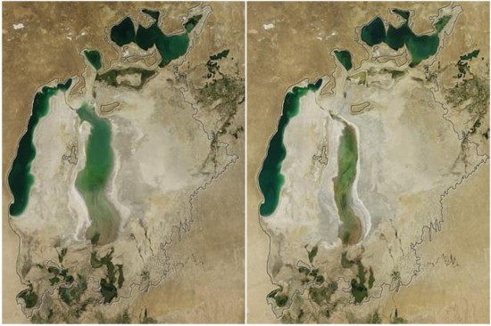 从60年代开始,苏联在咸海地区启动了灌溉农业项目,即把咸海的水分流至阿姆河和锡尔河中,来种植利润较高但耗水量较大的棉花,由此咸海面积不断缩?。坏?0年代早期,咸海仍是世界第四大湖泊。图中为2010年与2012年咸海面积对比图。