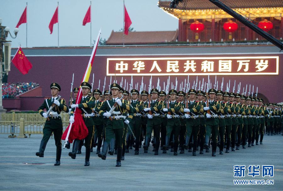 10月1日,国旗护卫队战士护送国旗走向天安门广场。当日清晨,来自全国各地的约12万名群众在北京天安门广场观看升国旗仪式,庆祝中华人民共和国成立65周年。 新华社记者 罗晓光 摄