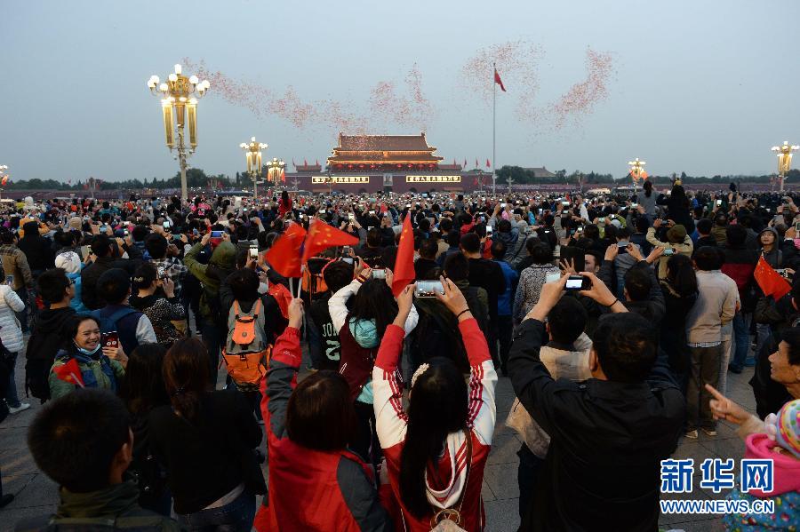 10月1日,人们在观看升国旗仪式后拍摄腾空而起的气球。