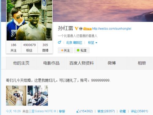 经过6年的爱情长跑,44岁的孙红雷与29岁的妻子王骏迪修成正果,昨日在法国巴黎举行了婚礼。孙红雷也在微博上高调宣布婚讯:“哥们儿今天结婚,这是我媳妇儿??梢运胬窳?,账号:999999999。”同时,他还自曝了两张婚礼现场的照片。