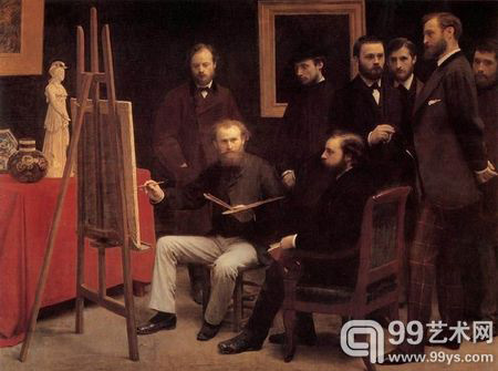 马奈的朋友亨利·方丹-拉图尔在历史上尽管不是个多么出名的画家,却因善化自己小圈子的著名朋友们而为世界留下了珍贵的历史资料。在1870年的《巴迪侬画室》(A Studio in Les Batignolles)中,印象派小团体的著名人物一应俱全,细品可真是趣味十足。穿浅色裤子坐着画画的是马奈,他画的对象是雕塑家阿斯特鲁。后面站着的从左到右分别是:德国画家斯歇尔德雷,雷诺阿,左拉,公务员梅特尔,画家让·弗雷德里克·巴齐耶和莫奈。