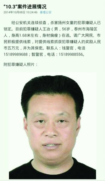 阅读提示:10月3日,扬州8岁女童王彦雯跟奶奶到泰州姜堰华港镇吃喜酒时失踪遇害。7日,泰州警方发布通告,悬赏5万缉凶。同日,警方再次发布协查通报,明确嫌犯具体身份信息。8日中午11点多,今年56岁的嫌犯王冶在泰州姜堰一农田简易工棚前放鞭炮、纵火时被人发现,后被警方抓获。