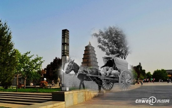 “穿越”时光的马车经过大雁塔。李高峰/制图