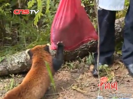 张凤芝说,自己远远地跟着小黄妹跑了快两公里,看到它在一棵新断裂的树干旁停了下来。所看到的情景也让张凤芝吃了一惊——一棵40公分粗的树干横倒在地上,而一直没有出现的小熊猫圆圆被齐腰压住,“看起来像是已经死了或昏迷了。”随即,张凤芝赶紧打电话给医生,由于对当时的情况不太清楚,张凤芝便在一旁观察,生怕惊吓到它们。