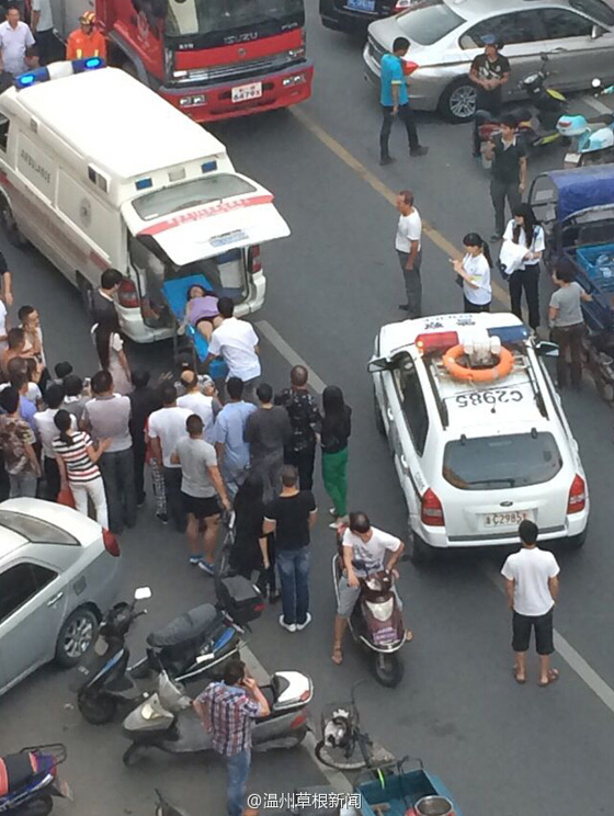 女子被放上救护车。