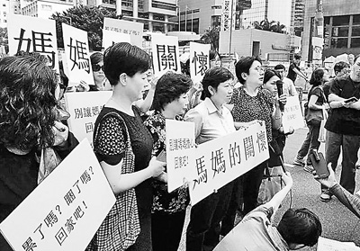 10日,数十名“妈妈团”到金钟,手持“别让妈妈担心,回家吧!”的标语牌,劝喻“占中”学生回家。