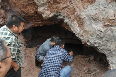 工作人员在古墓门口勘查。