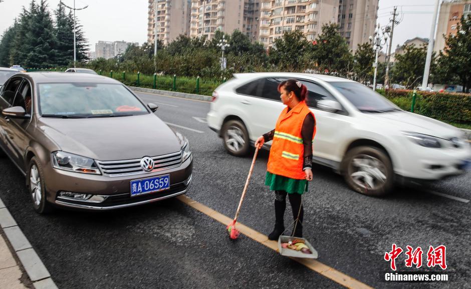 图为10月12日,46岁的邓书香在自己的车旁清扫责任路段,11年前环卫所招工她过来的。中新社发 张浩 摄