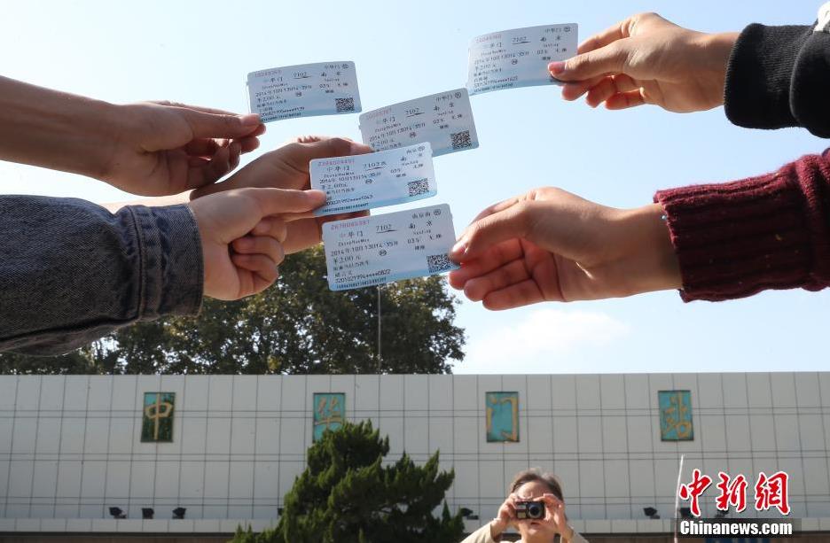 10月13日,市民展示在中华门火车站上车的车票。从10月14日凌晨起,拥有78年历史的南京中华门火车站将停止办理客运业务,连日来市民蜂拥而至,用乘坐客车的方式告别这座老牌火车站。南京中华门火车站于1935年4月随江南铁路的建成而同步投入使用,是中国著名的近现代铁路历史建筑。中新社发 泱波 摄