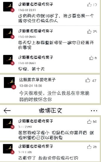 2013年8月的一天,男孩意外去世。她无尽悲伤,久久不能自拔,无法寄托哀思的情况下,便去他的微博上留言,“分享快乐”“吐槽考试”“偶尔卖萌”“寄托思念”和“碎碎念”,从2013年8月到今天,女孩“@这颗薰衣草爱吃栗子”依旧在怀念深爱的男孩“@李嘉乐奋而知之”,一条条留言承载着女孩对男孩深深的思念。