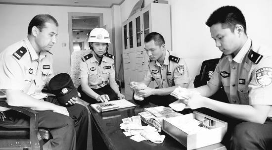 8月6日晚上8点,司马义(左一)和督查组的同事清点爱心款。崔岱摄