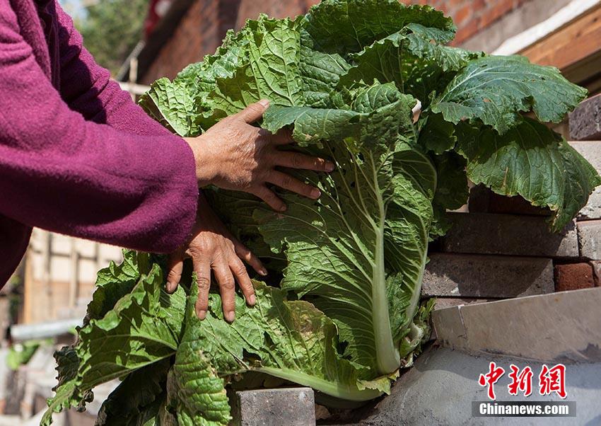 10月20日,长春市一小区内,居民正在查看一颗大白菜。8月中旬,有小区居民在菜池里种了一些白菜,一个月后,有一颗白菜从菜池的水泥缝里挤了出来,如今,这颗白菜越长越大,叶部直径已经超过了一米。中新社发 蒋盛松 摄