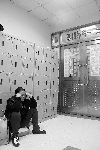 子萱妈妈坐在北京儿童医院病房外等待消息 摄/记者 王硕