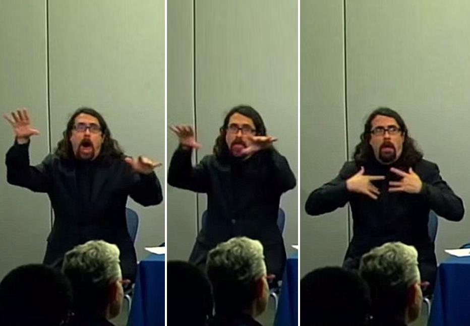 英国《每日邮报》10月26日报道,美国纽约上周确诊首例感染埃博拉患者,市长白思豪联同卫生官员召开记者会,但观众焦点却不在埃博拉个案上,而是坐在白思豪旁边的手语传译员。这名手语传译员表情丰富、动作夸张,为沉闷的记者会添加不少笑料,一夜间成为大批网民追捧的对象。(网页截图)
