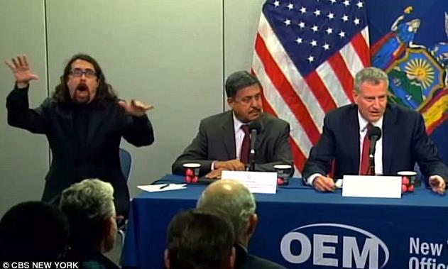 英国《每日邮报》10月26日报道,美国纽约上周确诊首例感染埃博拉患者,市长白思豪联同卫生官员召开记者会,但观众焦点却不在埃博拉个案上,而是坐在白思豪旁边的手语传译员。这名手语传译员表情丰富、动作夸张,为沉闷的记者会添加不少笑料,一夜间成为大批网民追捧的对象。(网页截图)