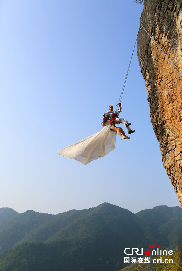 浙江攀岩爱好者夫妇悬崖上拍婚纱照